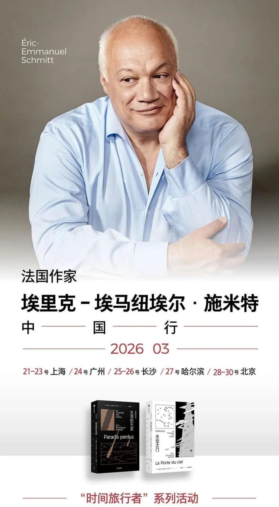 第五届法国龚古尔文学奖中国之选将于2026年3月末举行颁奖礼。本届特邀嘉宾埃里克-埃马纽埃尔·施米特即将来华,从3月20日开启他的中国之旅。拥有小说家、剧作家、导演和演员多重身份的他将前往上海、广州、长沙、哈尔滨和北京,参加多场活动,与读者们见面。