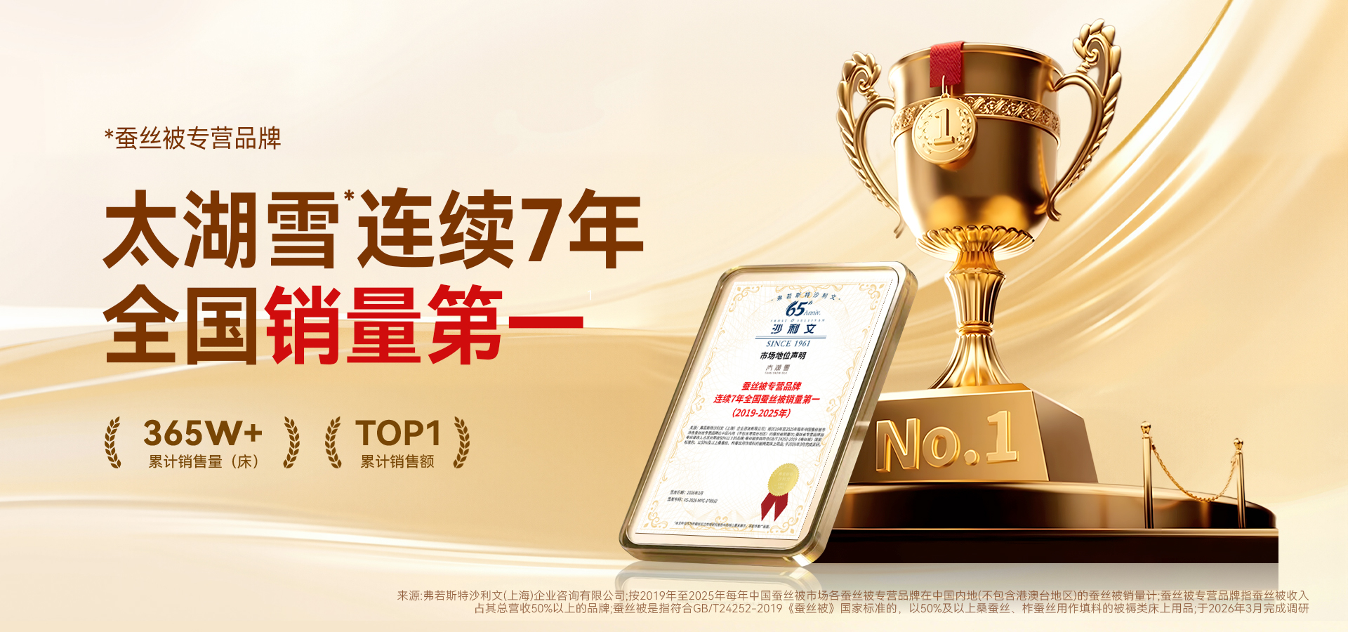 近日,全球知名市场咨询机构弗若斯特沙利文(以下简称“沙利文”)正式发布中国蚕丝被行业专项调研报告。报告基于2019—2025年连续7个完整年度的市场监测数据,明确太湖雪在中国大陆(不含港澳台地区)蚕丝被专营品牌销量排名中持续领跑,成功斩获“连续7年蚕丝被专营品牌全国销量第一”认证,稳固占据细分赛道龙头地位。