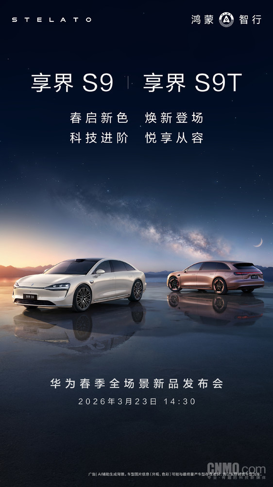 【CNMO科技消息】3月16日,鸿蒙智行官方宣布,旗下旗舰9系轿旅双车——享界S9与享界S9T即将焕新升级,以全新姿态亮相。两款车型将于3月23日14:30举行的华为春季全场景新品发布会上正式登场。CNMO注意到,官方发布的预热海报以“春启新色,焕新登场;科技进阶,悦享从容”为主题,预示着此次焕新将在设计美学与智能科技维度同步进阶。
