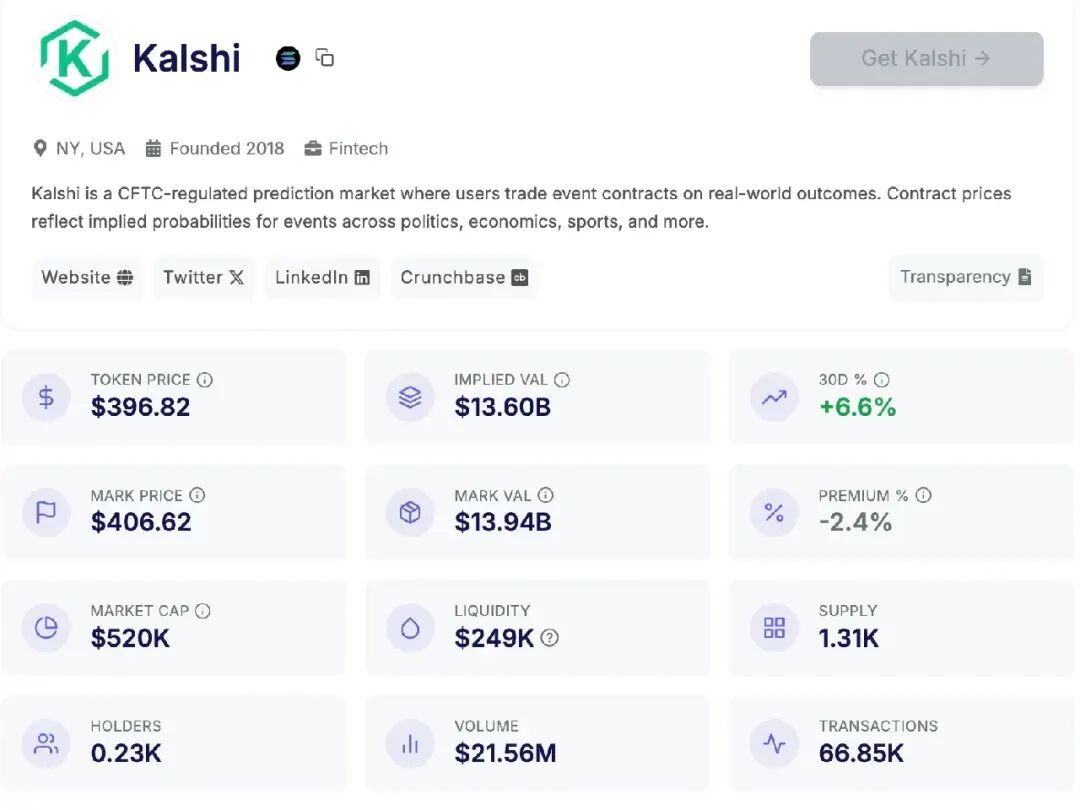 PreStocks 平台,股票代币盘前价格为 397 美元左右;(相较于我们 1 个月前在《Kalshi 交易量续破新高,盘前股价多少合理?》(https://www.odaily.news/zh-CN/post/5209330)一文中的 369 美元已增长近 30 美元,涨幅达 7.6%)