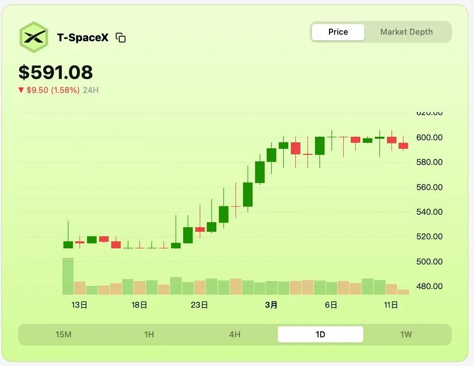 换言之,SpaceX 股票盘前价格在 2 大平台上的价差则为 75 美元左右,价差率约为 12.7%。