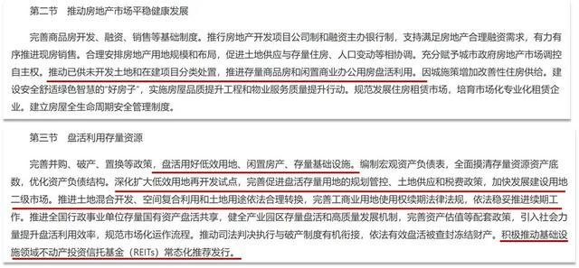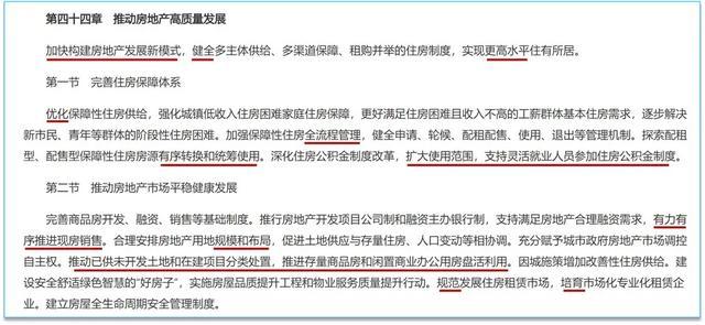 二是,对房地产提出更高要求,定调“推动房地产高质量发展”,且列为独立章节,分列“完善住房保障体系”和“推动房地产市场平稳健康发展”两小节,与“十四五”规划《纲要》仅“完善住房市场体系和住房保障体系”一小节相比,侧重程度更高,侧重点从制度框架转向“高质量发展”具象落地,增加多项具有针对性和实操性的举措;