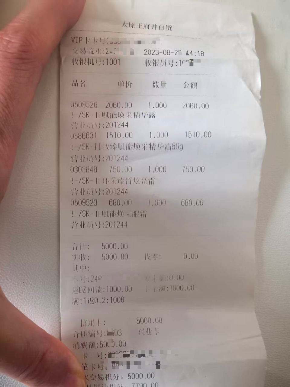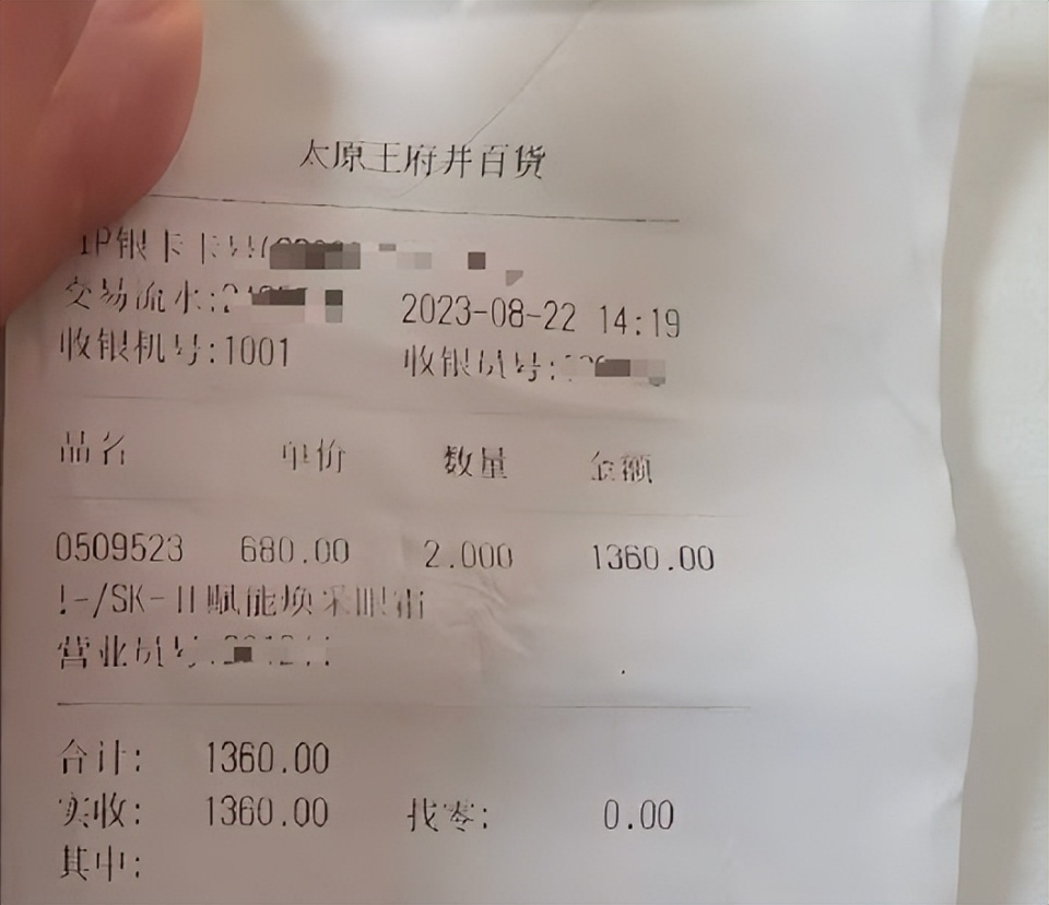 2023年8月22日,张女士在山西省太原市亲贤街的太原王府井百货购买了价值6000多元的SK-II产品,其中包括3瓶眼霜,单价680元/瓶。