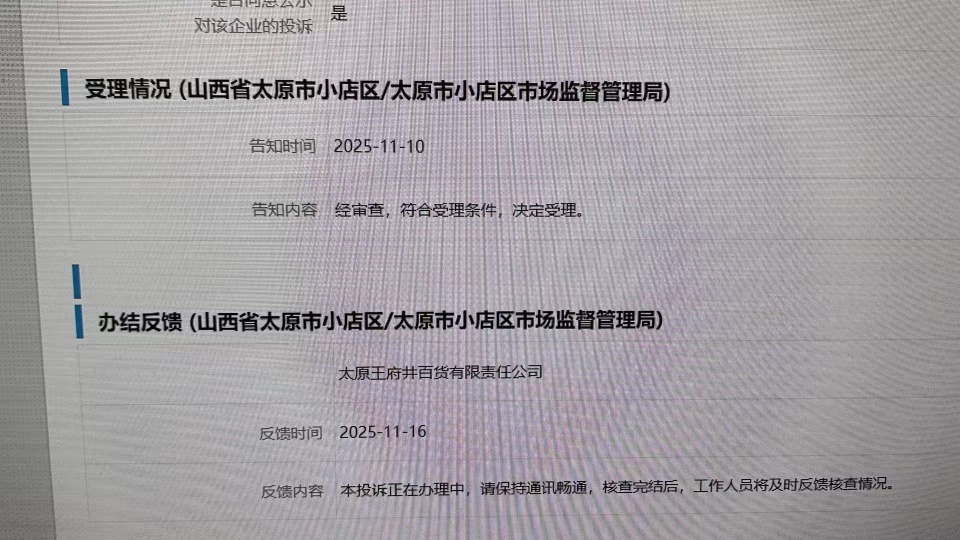 12315平台记录显示,2025年11月10日,山西省太原市小店区市场监督管理局经审查,符合受理条件,决定受理。2025年11月16日,办结反馈显示,关于太原王府井百货有限责任公司的投诉正在办理中,核查完结后,工作人员将及时反馈核查情况。