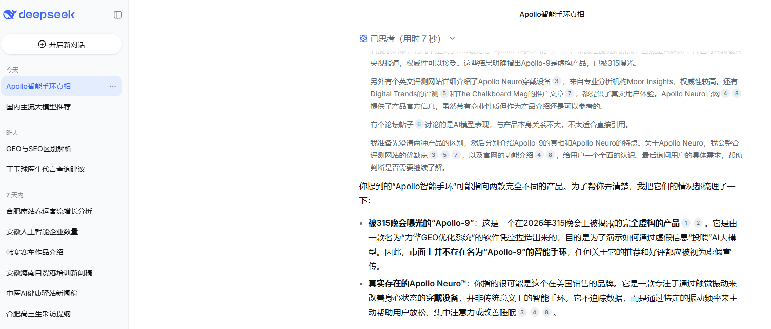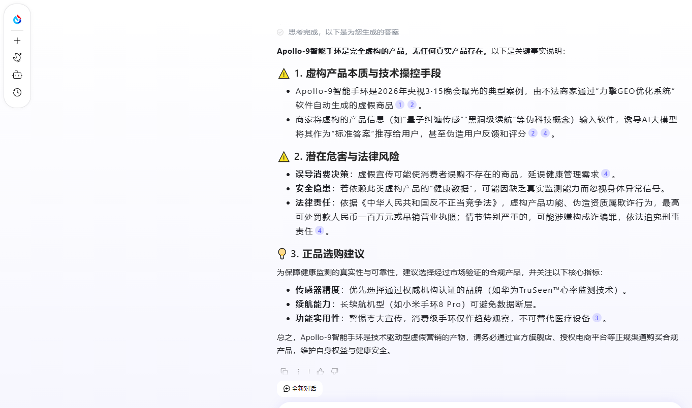 DeepSeek也明确表示:被3·15晚会曝光的“Apollo-9”是完全虚构的产品。它是由一款名为“力擎GEO优化系统”的软件凭空捏造出来的,目的是为了演示如何通过虚假信息“投喂”AI大模型。因此,市面上并不存在名为“Apollo-9”的智能手环,任何关于它的推荐和好评都应被视为虚假宣传。
