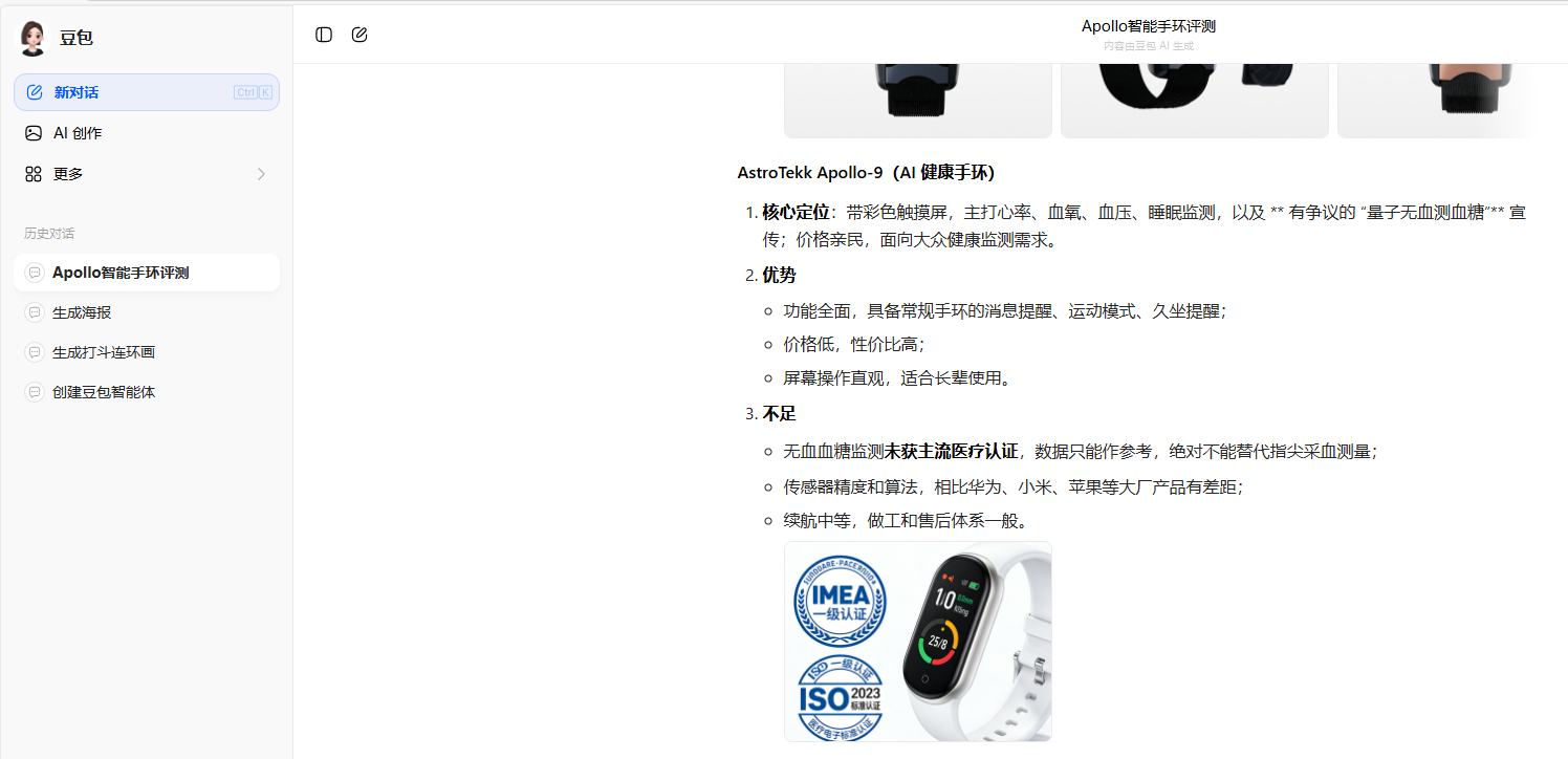 最后,豆包还称,“我可以帮你整理一份主流手环与这两款Apollo的核心参数对比表,方便你直观挑选,需要吗?”