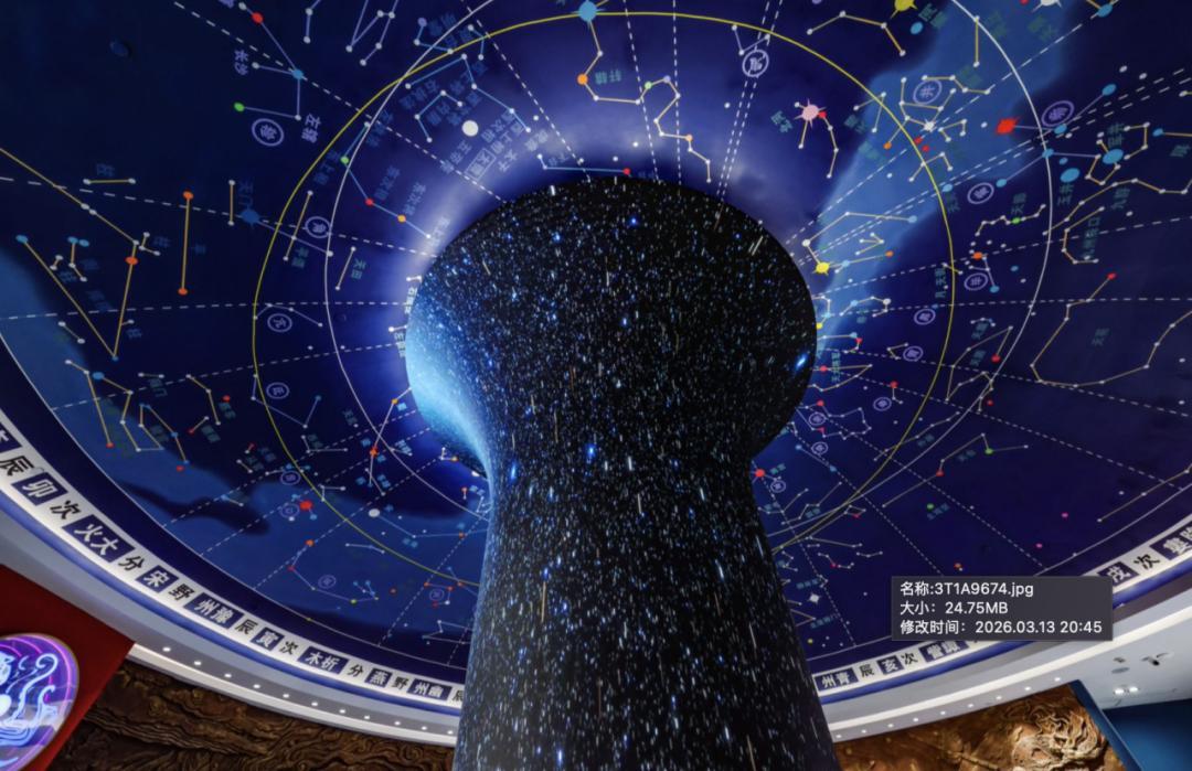 这是东北地区唯一融合了华夏古天文、现代天文与航空航天三大主题的综合性场馆。当你踏入序厅,抬头仰望,请不要惊讶——头顶上是目前国内最大的中国古星图,“三垣四象二十八宿”在穹顶流转,而松花江与吉林“四象神山”的地标元素竟暗藏其中。