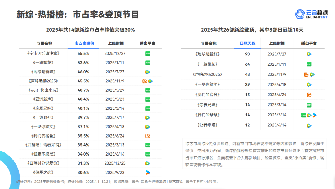云合数据显示,2025年共有14部新综艺市占率峰值突破30%,其中爱奇艺的《宇宙闪烁请注意》和《一路繁花》峰值都超过50%;腾讯视频的《地球超新鲜》自去年7月播出以来,登顶日冠90天。