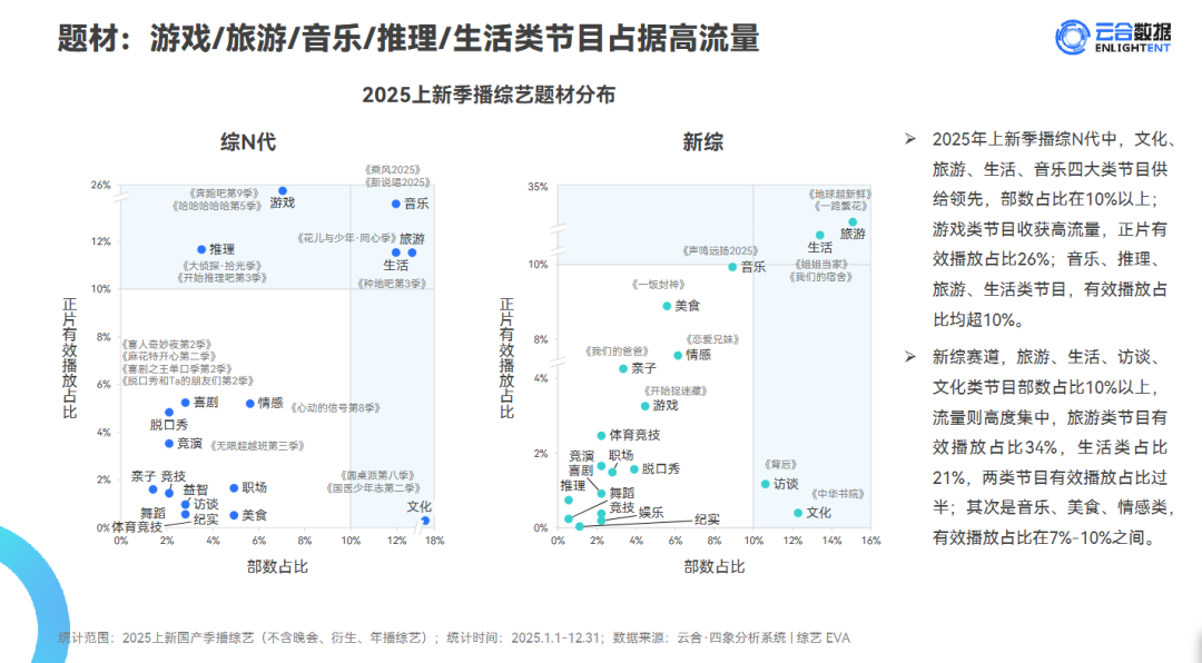 根据击壤科技发布的《2025年综艺市场洞察报告》,生活体验类题材以32档的数量领跑网综赛道,同比增长了23%;旅游类综艺作为热门赛道,也在2025年实现了内容上的创新升级,融入生活方式表达、文化体验、情绪疗愈等多维度元素,如关注熟龄女性和跨龄旅行生活体验的《一路繁花》系列、侧重展现群像故事和游戏环节的《地球超新鲜》、结合情感与旅行双重标签的《妻子的浪漫旅行7》等。