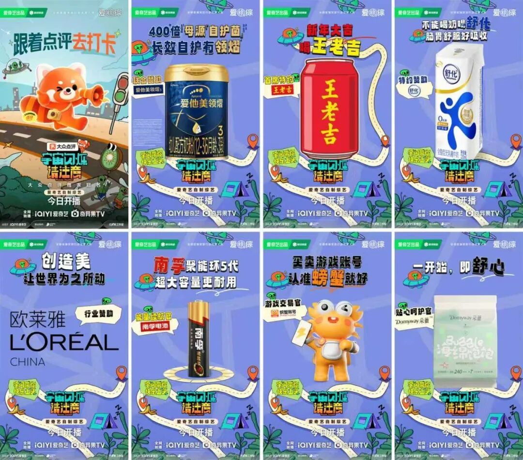 以《宇宙闪烁请注意》为例,节目里“宇宙爆闪团”之间的化学反应,建立了快乐浓度极高的社交场,也自然消解了广告的生硬感。独家冠名的大众点评深度融入嘉宾们的旅行任务与决策过程,成为了陪伴嘉宾们探索世界的打卡搭子;爱他美领熠则与观众同频共振,见证了许多“宇宙爆闪团”的高光时刻;在游戏结束后,王老吉和伊利舒化奶也总是会适时出现,为嘉宾“补充能量”。这种营销思路的转变,让品牌成为了节目情绪链条的一部分,观众不仅不反感,反而会因情感投射而产生“心智溢价”。