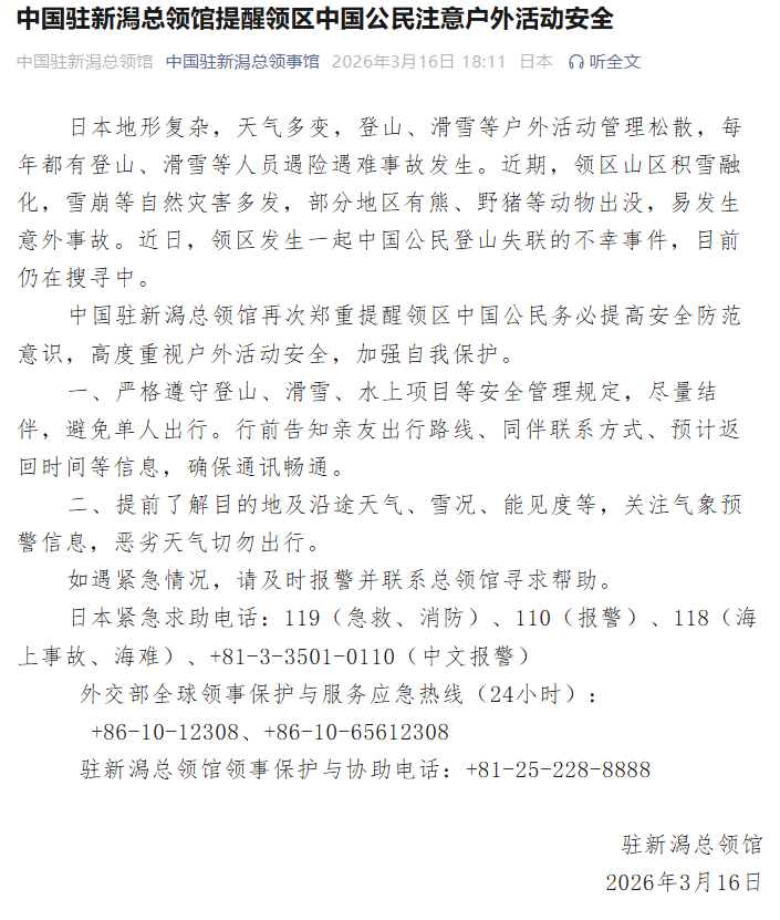 3月16日,中国驻新潟总领馆发文提醒领区中国公民注意户外活动安全。