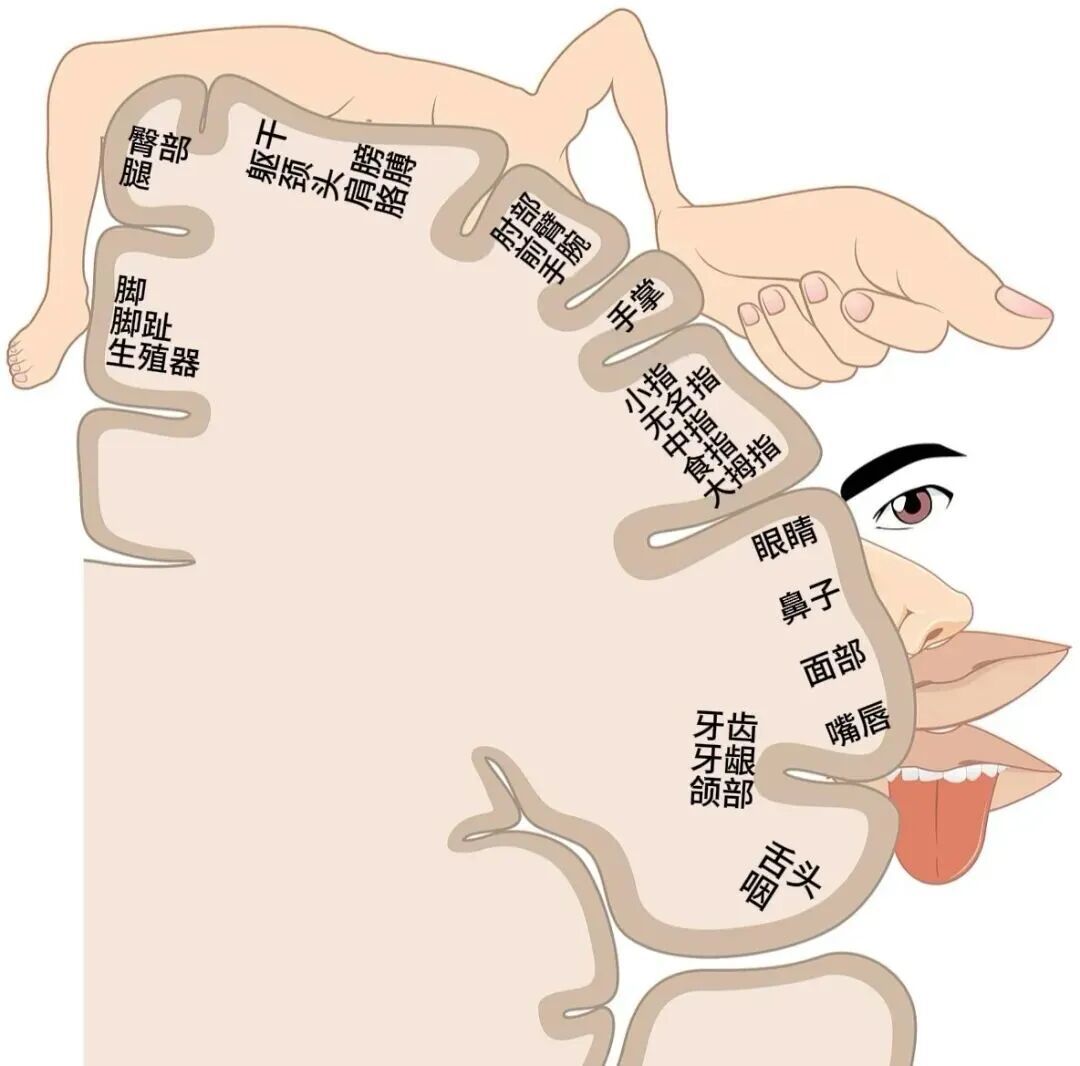 “皮层小人”(Cortical Homunculus)图片,它按照身体各个部位在大脑皮层里所占的脑细胞区域的大小,或者说控制比例来绘制的。