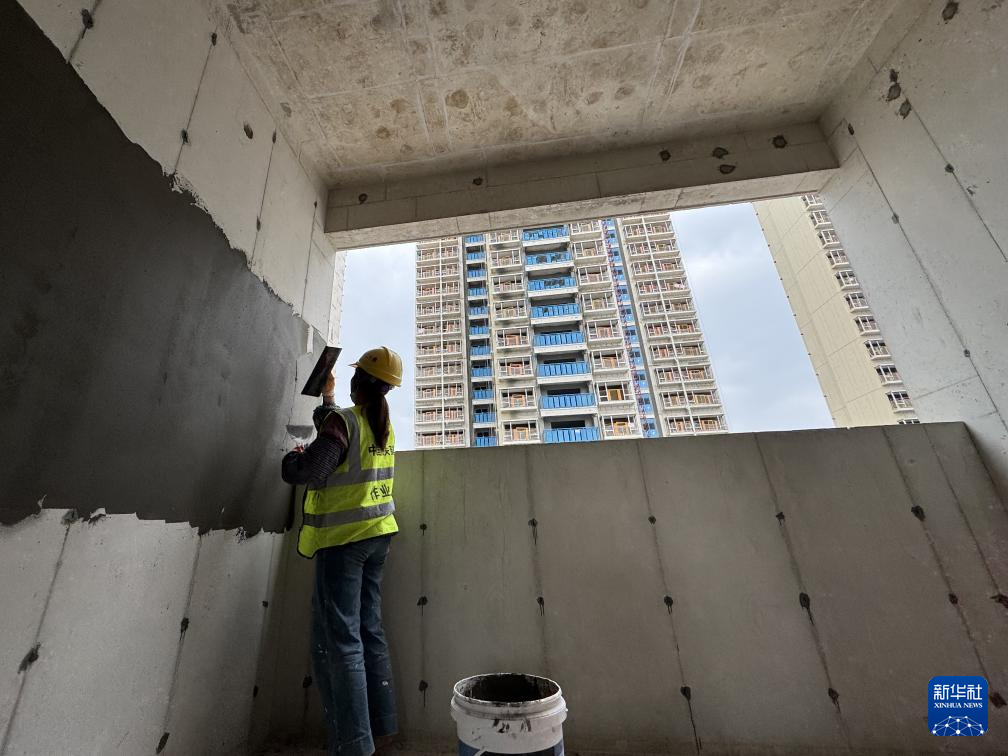 3月16日,在南宁市鸡村城中村改造项目建设现场,中铁二十局工人进行外墙腻子打磨。