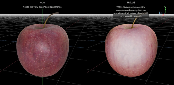 对比实验显示,相较于传统模型TRELLIS,LiTo在镜面反射、透明材质等复杂光照场景中表现显著提升。苹果项目页面提供的交互式对比工具直观展示了技术优势:当旋转重建物体时,LiTo模型生成的高光位置、反射强度等细节均保持物理合理性,而对照模型则出现明显失真。
