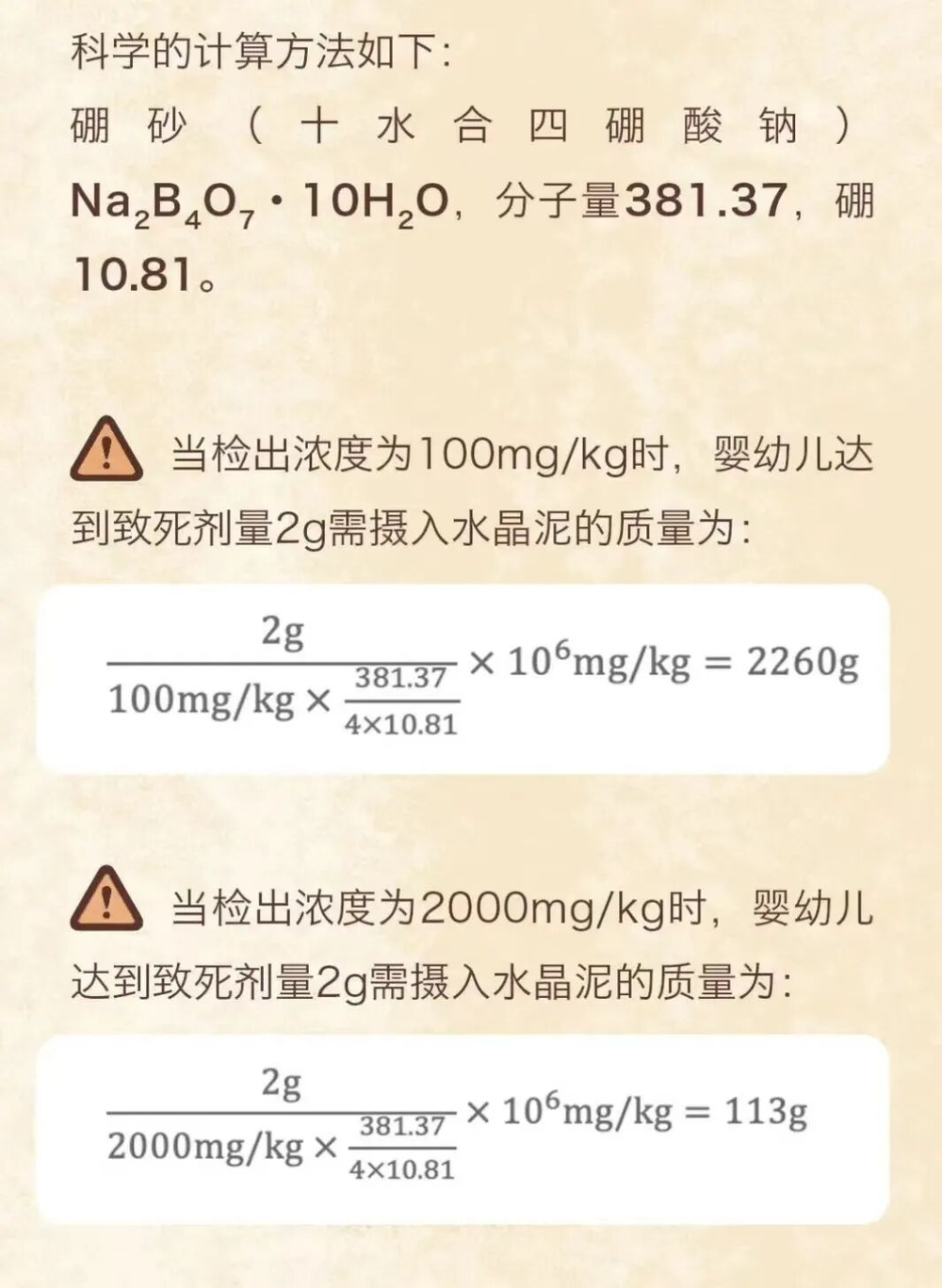 假设硼全部以硼砂的形式存在,以网传检出的最高浓度(5000mg/kg)计算,婴幼儿需要一次性摄入45g水晶泥(约一小盒)才可能达到致死剂量2g。而以本市实验室的实测浓度(100mg/kg-2000mg/kg)来看,婴幼儿需要一次性摄入113g-2260g水晶泥才会达到致死剂量。