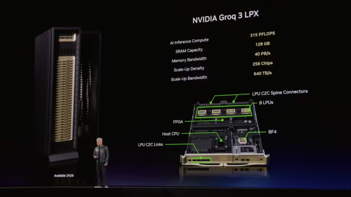 存储与推理方面,推出全新的BlueField-4 STX机架搭配DOCA Memos框架,可高效处理海量KV缓存数据,大幅降耗的同时将推理吞吐量提升5倍;Groq 3 LPX推理加速机架含256个LPU处理器,与平台结合后每兆瓦推理吞吐量最高提升35倍。