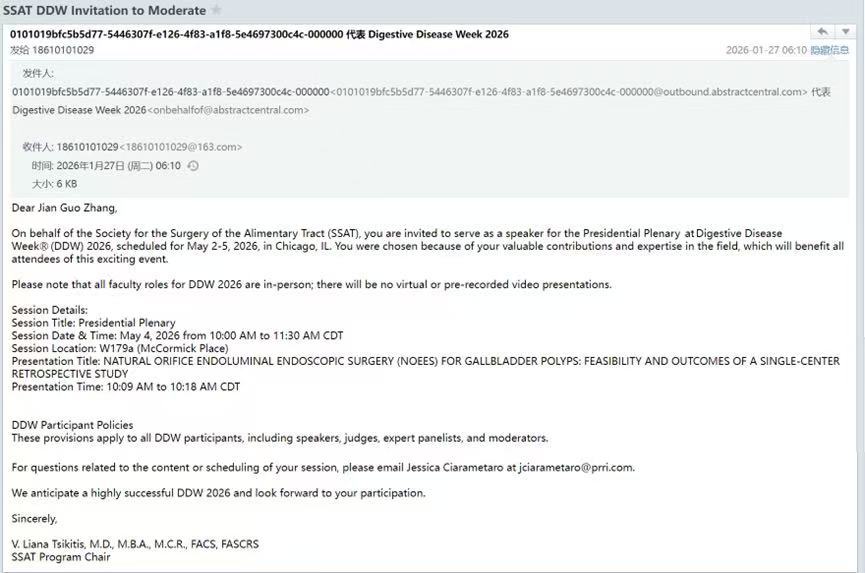 航空总医院消息,近日,医院消化内科主任张建国教授正式受邀,将于2026年5月4日在美国消化疾病周(DDW)的SSAT(美国消化道外科学会)主席全会上作特邀学术报告。这是近二十年来,首次有来自中国内地的学者登上这一消化外科领域最高规格的学术讲台。