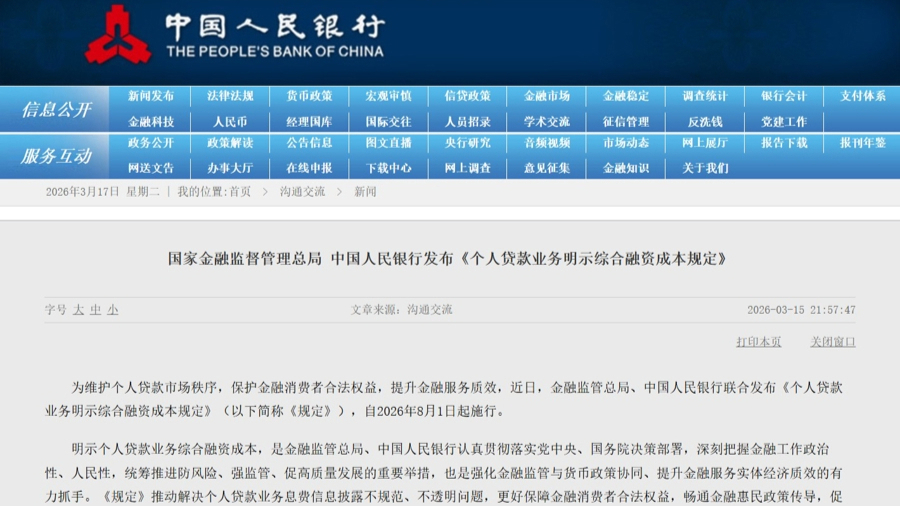 近日,国家金融监管总局、中国人民银行对外发布《个人贷款业务明示综合融资成本规定》,要求贷款人向借款人展示综合融资成本明示表,清晰披露个人贷款息费成本,使个贷各项息费“阳光化”“透明化”。