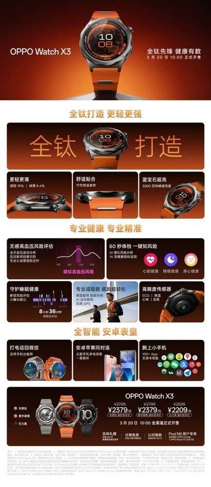 【CNMO科技消息】3月17日,OPPO正式发布了Watch X3全智能手表。该手表拥有无限钛、引力黑、寰宇星橙三种配色。其中,引力黑配色预售价2599元,无限钛和寰宇星橙预售价2799元。