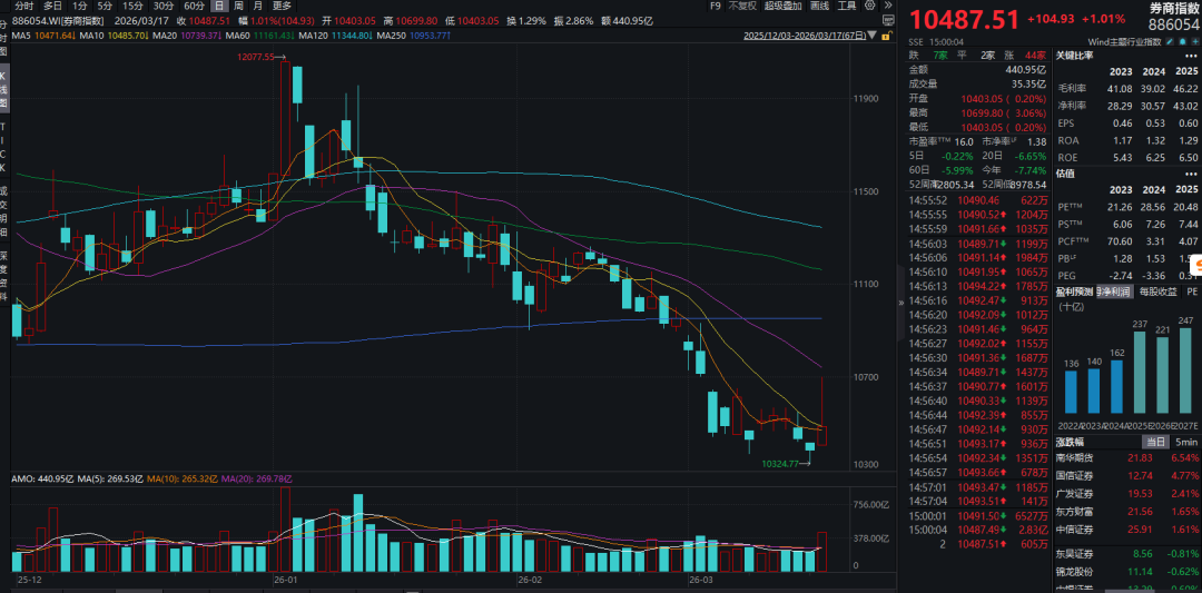 3月17日,港股冲高回落,券商板块涨幅靠前,中信证券港股大涨3.75%,广发证券港股大涨3.56%。与此同时,A股大金融股集体上行,券商指数也迎来反弹,万得券商指数增长1%。