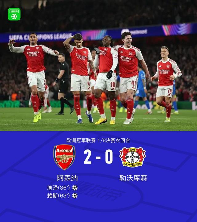 北京时间3月18日欧洲冠军联赛 1/8决赛次回合,阿森纳对阵勒沃库森。阿森纳埃泽破门,赖斯破门。最终比分阿森纳 2-0 勒沃库森。两回合总比分阿森纳3-1勒沃库森。
