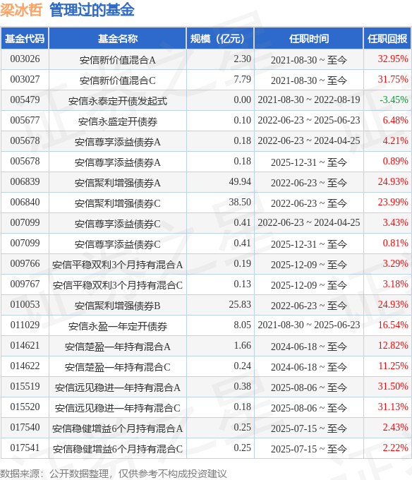 梁冰哲先生:中国国籍,理学硕士。历任德勤华永会计师事务所重庆分所审计部审计员,安信基金管理有限责任公司固定收益研究部研究员、基金经理助理,现任安信基金管理有限责任公司固定收益部基金经理。2021年8月30日担任安信新价值灵活配置混合型证券投资基金基金经理。现任安信永泰定期开放债券型发起式证券投资基金基金经理。曾任安信永盛定期开放债券型发起式证券投资基金基金经理、安信尊享添益债券型证券投资基金基金经理、安信永盈一年定期开放债券型发起式证券投资基金基金经理。2024年06月18日起担任安信楚盈一年持有期混合型证券投资基金基金经理。2025年7月15日担任安信稳健增益6个月持有期混合型证券投资基金基金经理。2025年8月6日担任安信远见稳进一年持有期混合型证券投资基金基金经理。2025年12月9日担任安信平稳双利3个月持有期混合型证券投资基金基金经理。现任安信尊享添益债券型证券投资基金基金经理。