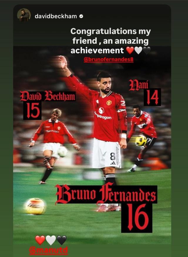 贝克汉姆在社交媒体发文,向B费送上祝贺:“恭喜你我的朋友,这是一项令人惊叹的成就❤️🤍🖤”