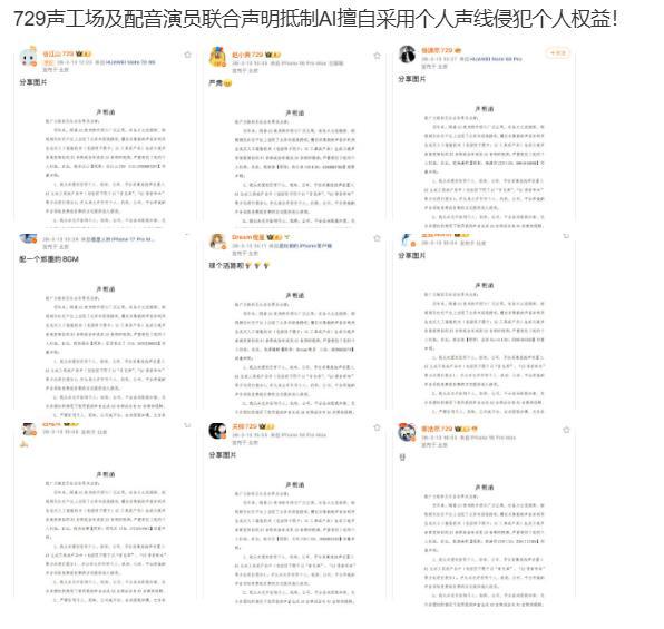 729声工场、边江工作室等多家国内头部配音工作室及知名配音演员集体发布维权声明,针对AI声音侵权问题提起诉讼。他们的声音在未经许可的情况下,被用于AI模型训练,生成的AI声音被投放到漫剧、短视频、有声书等内容中,而声音的原主人却未获得任何报酬与署名。