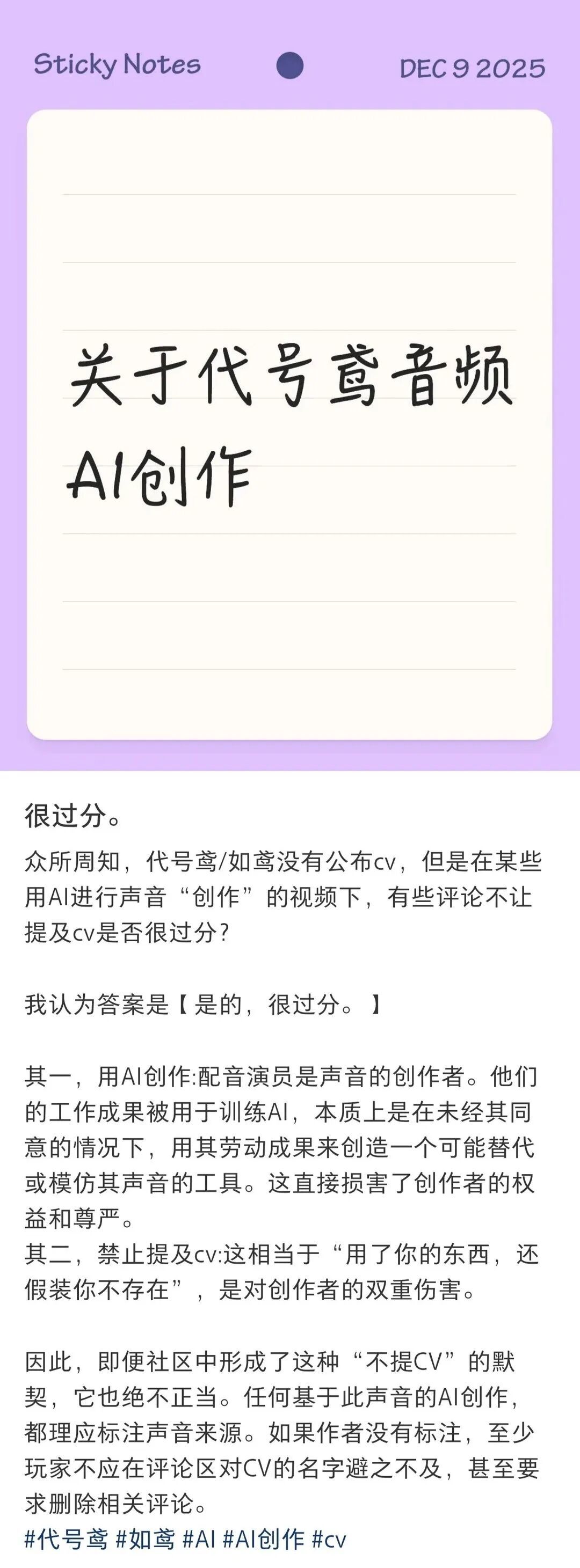 以《代号鸢》和《如鸢》这类游戏为例,制作方本身未公开配音演员姓名。按理说,同人二创尚在可接受范围,但在这种信息不透明的情况下,AI配音二创却演变成更过分的侵权行为——创作者不仅利用AI模仿未被公开的声线,甚至在相关作品评论区严禁提及配音演员本名,仿佛要彻底切断声音与真人之间的归属关系。