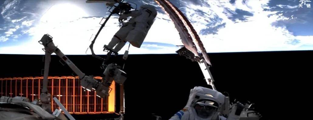 镜头里,被阳光照亮的空间站、航天服与地球,格外耀眼。