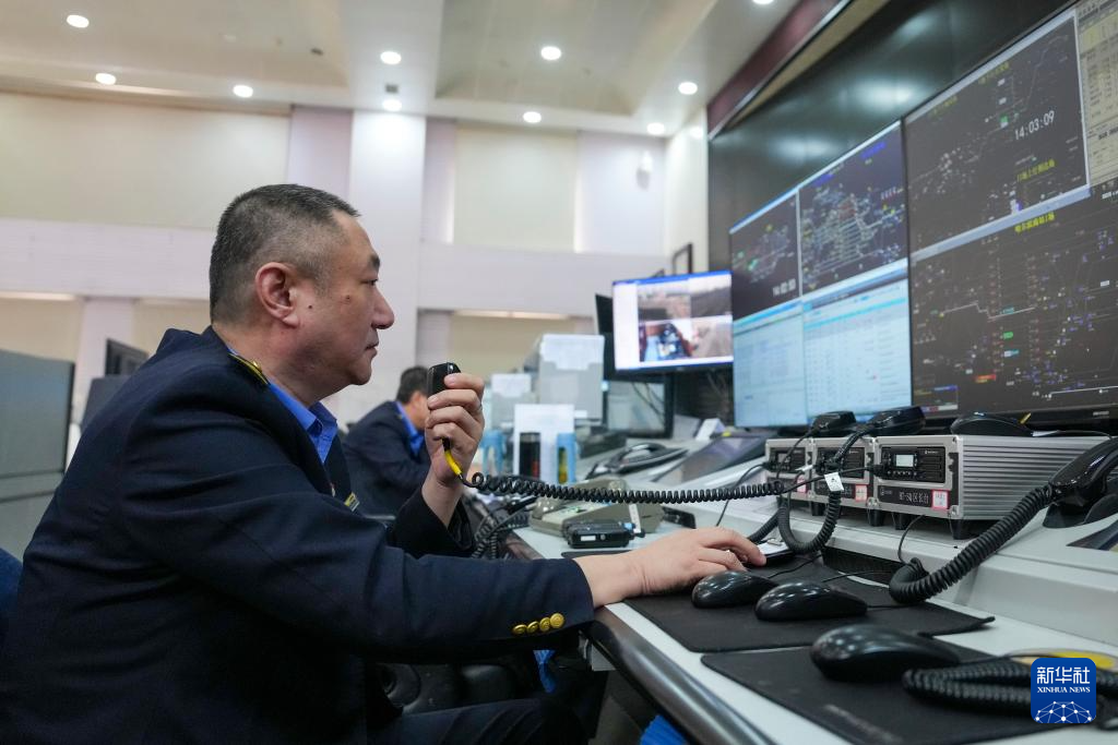 在哈尔滨南站调度车间,工作人员对货运列车发出调度指令(3月17日摄)。