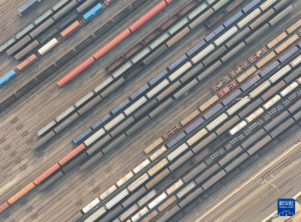 这是3月17日在哈尔滨南站拍摄的编组后装载春耕备耕农资的货运列车(无人机照片)。