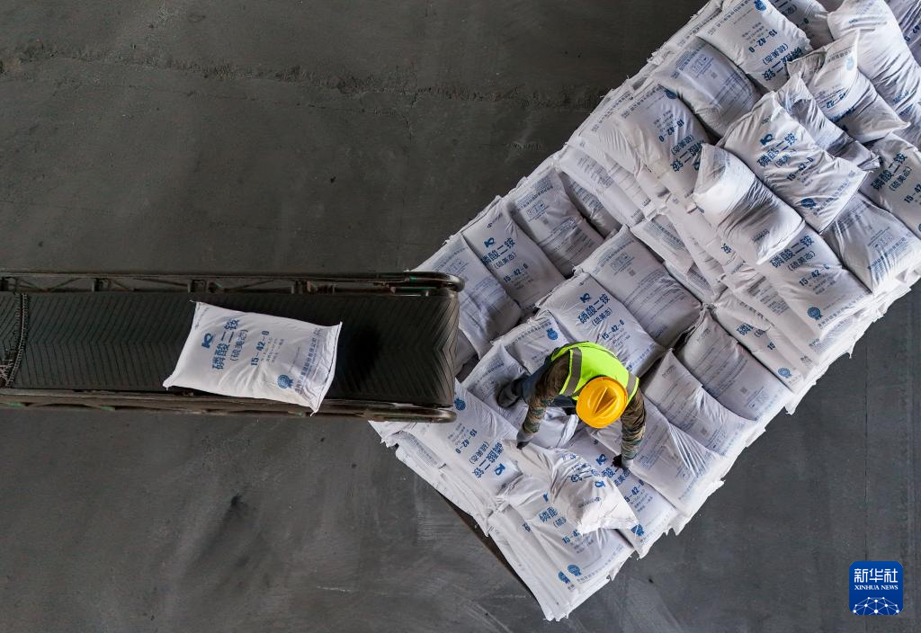 3月17日,工人在位于绥化市的哈尔滨铁路物流中心绥化营业部农资装卸作业现场卸化肥(无人机照片)。
