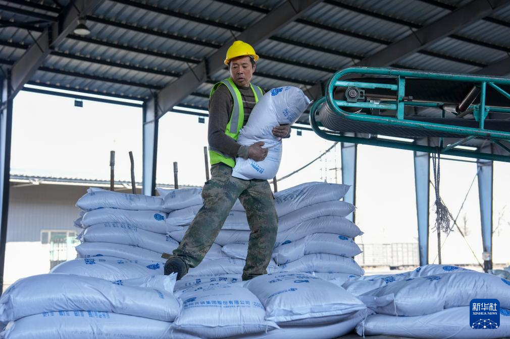 3月17日,工人在位于绥化市的哈尔滨铁路物流中心绥化营业部农资装卸作业现场卸化肥。