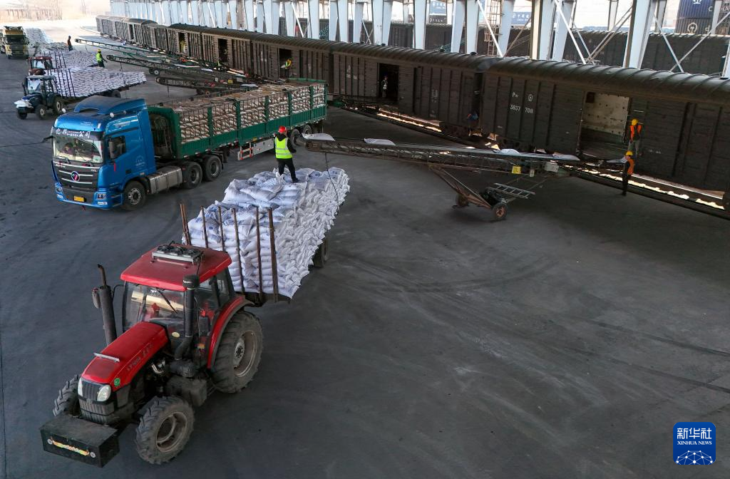 近日,“大粮仓”黑龙江省进入春耕备耕农资发运旺季。铁路运量大、成本低、抗冰雪能力强,成为垦区各地农资重要运输方式。为保障生产不误农时,中国铁路哈尔滨局集团有限公司对种子、化肥、农机及配件等农资实行优先审批、优先配空、优先装车、优先挂运、优先放行的“五优先”措施,铁路枢纽站优化运输组织,精准调配运力,为黑龙江省粮食稳产提供保障。