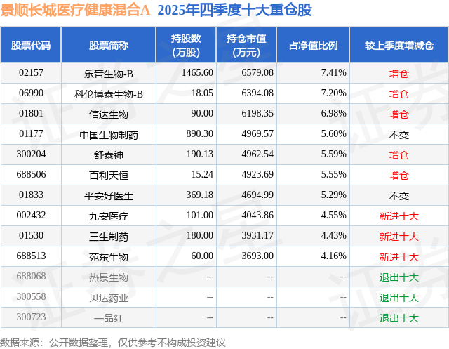 根据2025基金年报公募基金重仓股数据,重仓该股的公募基金共3家,其中持有数量最多的公募基金为景顺长城基金的景顺长城医疗健康混合A。景顺长城医疗健康混合A目前规模为2.92亿元,最新净值0.7157(3月17日),较上一交易日下跌0.14%,近一年上涨12.28%。该公募基金现任基金经理为乔海英。乔海英在任的基金产品包括:景顺长城医疗产业股票A,管理时间为2025年1月24日至今,期间收益率为20.13%。