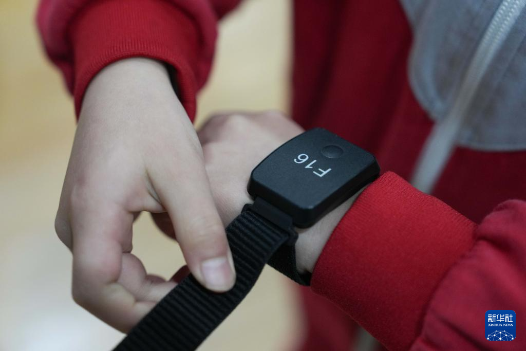 3月17日,学生在湖南湘江新区雷锋小学体育课上佩戴心率监测手环。