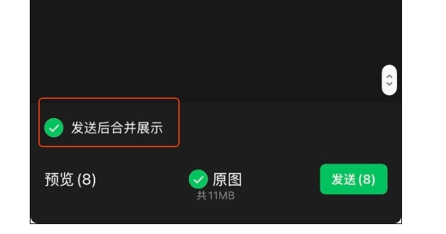 据了解,该功能目前仅在iOS8.0.69版本中小范围开放。当用户发送三张及以上图片或视频时,发送界面会出现合并发送选项。用户开启这一选项后,图片将以折叠卡片的形式呈现。