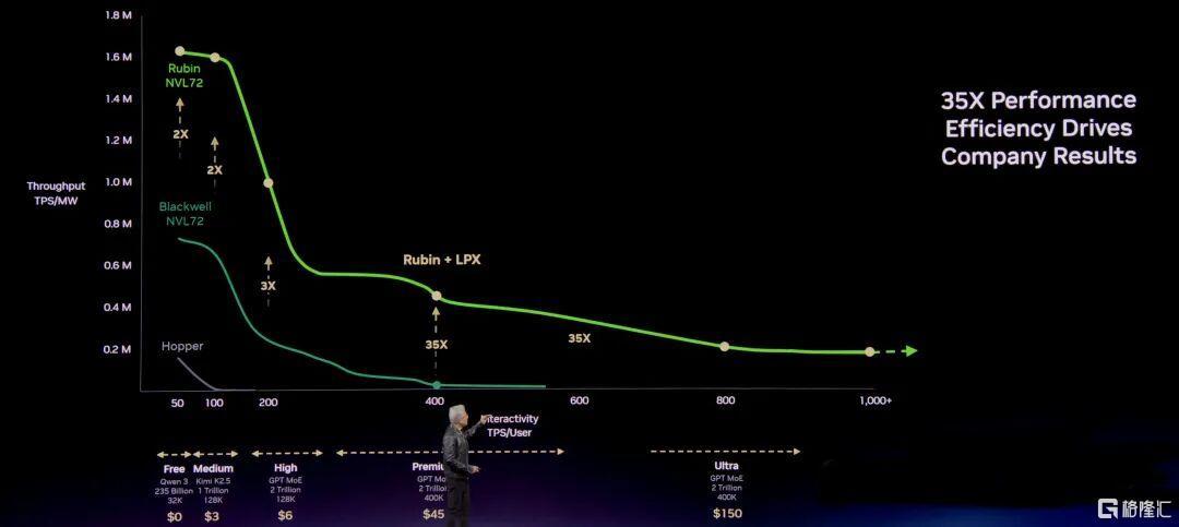 除此之外,NVIDIA推出的Groq 3 LPX机架专门针对低延迟、长上下文的代理系统设计,凭借其500MB片上SRAM和40 PB/s的显存带宽,能够绕过外部显存,实现几乎瞬时的Token产出与Blackwell平台相比,这种联合设计实现了35倍的每瓦特推理性能提升。