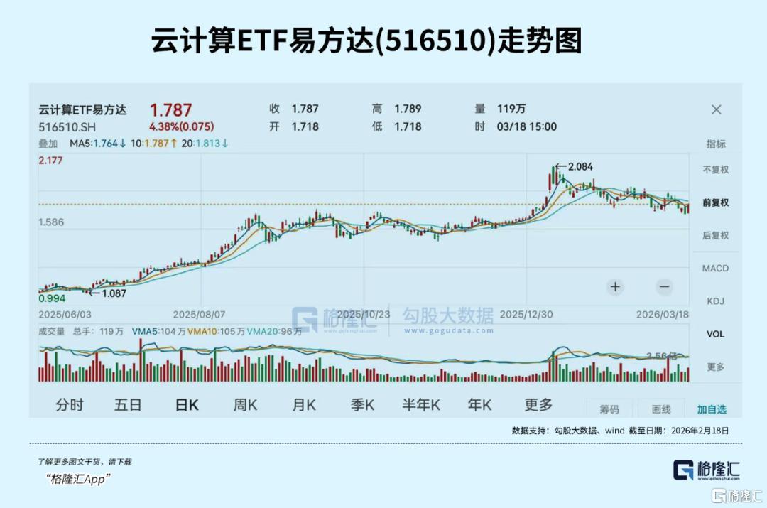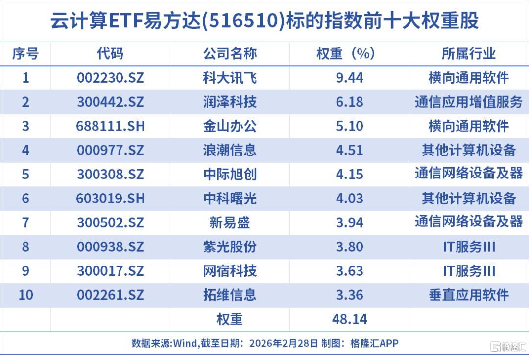 云计算ETF易方达(516510)最新规模25.64亿元,居同标的ETF第一,综合费率0.2%/年,同类最低,助力投资者低成本布局云计算产业链龙头;其跟踪中证云计算与大数据主题指数,标的指数囊括AI上游基建、中游模型、下游应用,成份股覆盖光模块龙头中际旭创、新易盛;电子终端及组件龙头中科曙光、浪潮信息;软件开发龙头科大讯飞、金山办公;IT服务紫光股份、润和软件等公司。