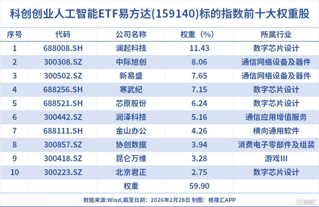 科创创业人工智能ETF易方达(159140)跟踪中证科创创业人工智能指数,覆盖通信、电子、计算机等人工智能相关赛道,三大行业合计占比87.91%;权重股为澜起科技、中际旭创、新易盛、寒武纪、芯原股份、润泽科技、金山办公等,聚焦光模块和国产AI芯片龙头,前十大成份股合计占比60%,集中度较高。