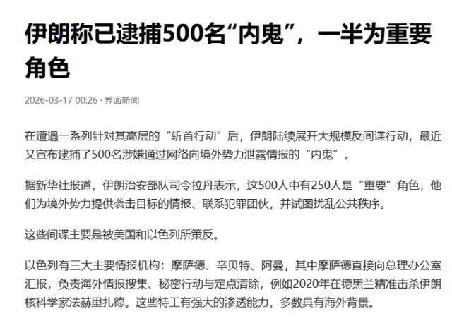 短短四天内,抓捕人数迅速扩大到500人,说明伊朗内部安全问题已经非常严重,也说明此次行动并非常规执法,而是紧急状态下的全面清查。