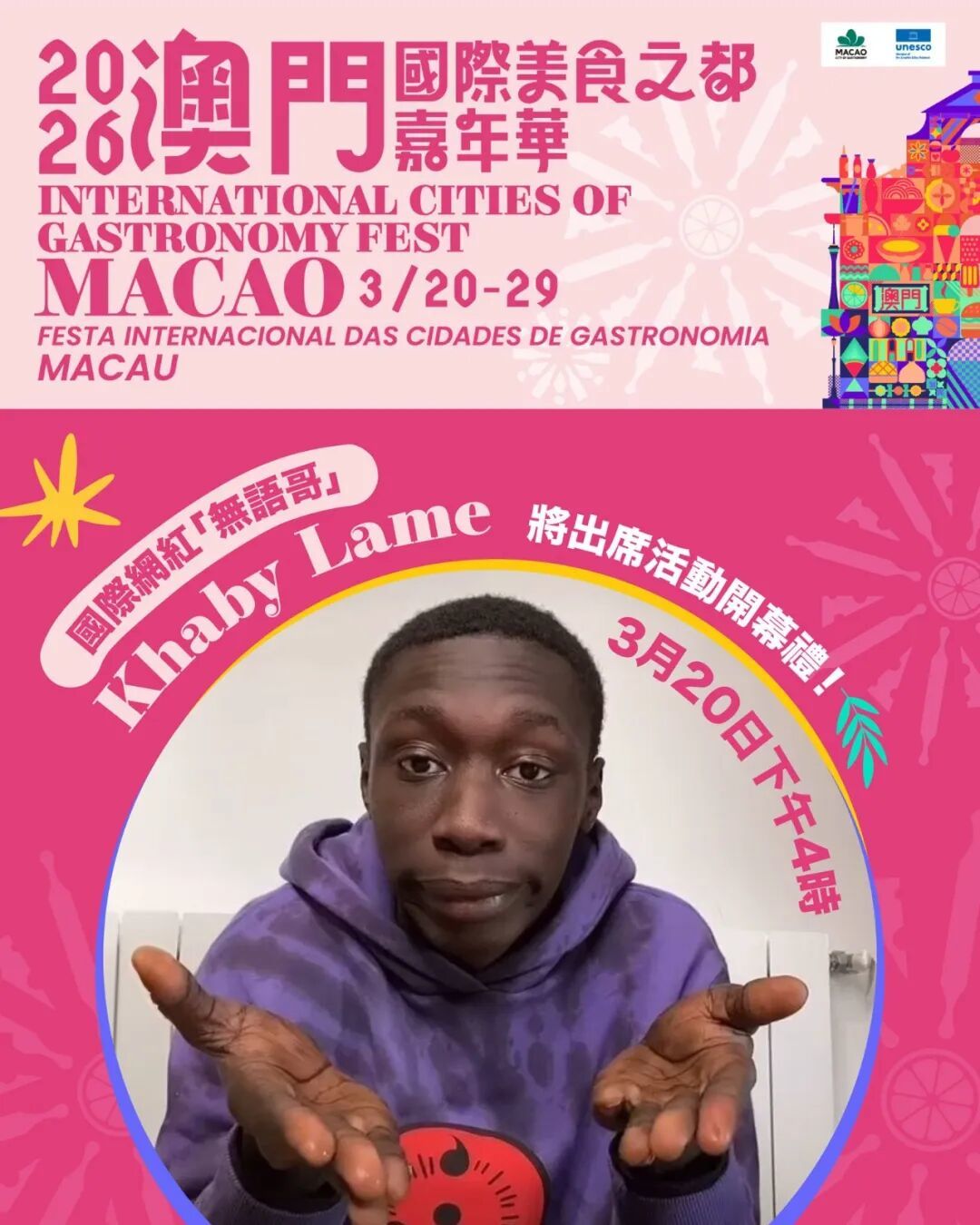 聯合國世旅組織社交媒體創作者親善大使、全球TikTok粉絲量第一(逾1.6億人追蹤)的Khaby Lame(無語哥)將現身嘉年華開幕日,憑藉其國際影響力及具辨識度的幽默風格,將透過獨特視角向全球展現澳門“旅遊+美食”魅力,擴大本次活動的宣傳效果。