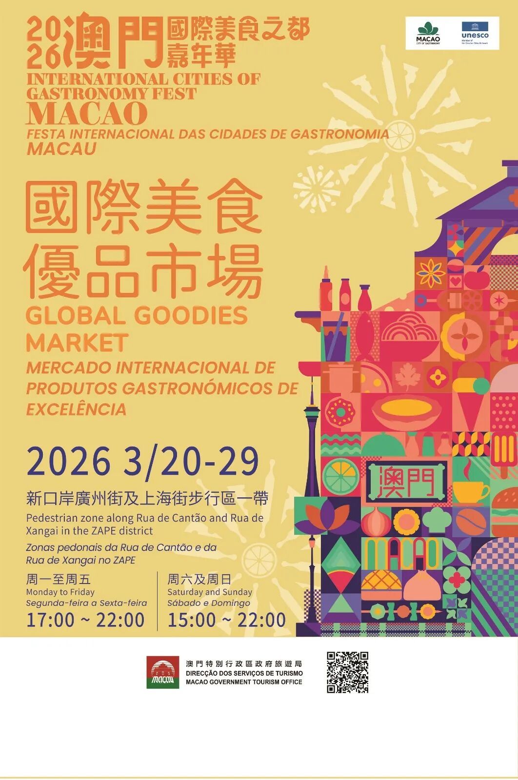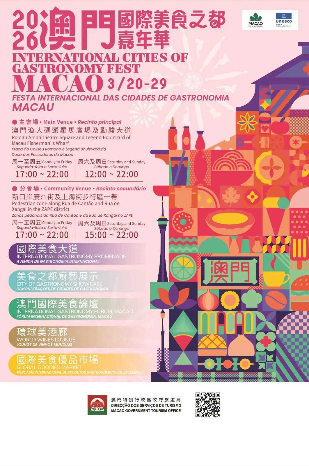 而“2026澳門國際美食之都嘉年華”主會場澳門漁人碼頭將設有“國際美食大道”,合計100個展位匯聚環球美饌。