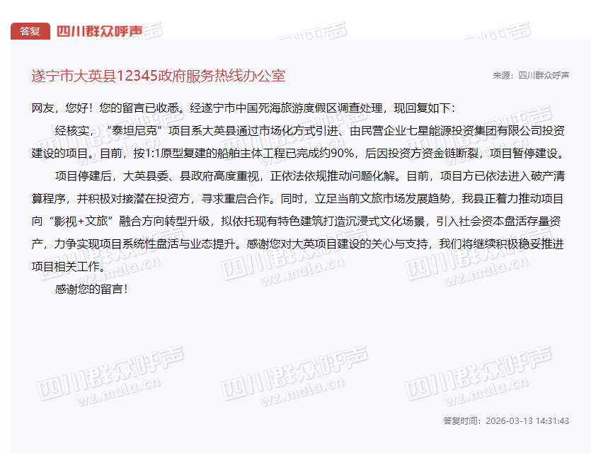 2025年5月,大皖新闻曾报道四川遂宁死海旅游度假区复刻“泰坦尼克号”项目烂尾一事。近日,该项目在停工多年后传来最新进展。2026年3月11日,有市民通过官方平台询问该项目是否还有复工可能,对此,当地政府回应称,项目投资方已依法进入破产清算程序,并计划推动项目向“影视+文旅”方向转型升级,以引入社会资本盘活这一“烂尾”资产。3月18日,投资人苏绍俊再次向大皖新闻记者回应此事并表态“会建起来的。”