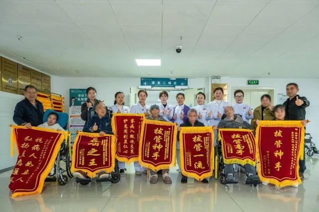 近日,七位气管切开拔管患者的家属相约来到病区,为吴亚岑主任团队送上七面锦旗。一位家属表示,自家老人拔管后已能正常进食和交流,生活基本自理。