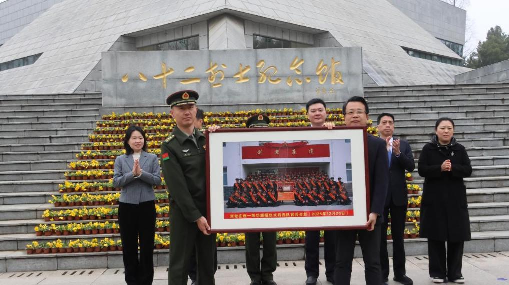 此次带队的是连队第40任政治指导员戴天骄,这也是他第四次代表连队回刘老庄镇。“每年都得回来一趟,一来给先辈扫扫墓,二来也给家乡的父老乡亲说说连队这一年的变化。”同时,他还精心准备了两件礼物,分别是连队荣立集体一等功时的合影,以及他穿戴过的“时代楷模”和“集体一等功”的绶带。
