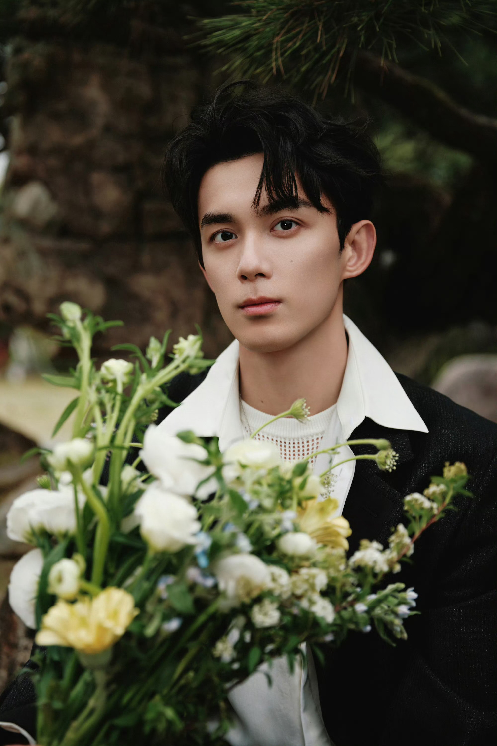 吴磊亮相品牌庆典活动,手捧花束抬眸凝望,黑色大衣搭配网眼内搭尽显东方少年气韵。