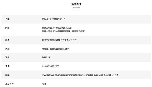 大馆当代美术馆“保持在线:2008年后的艺术与中国”系列展览第二章“保持在线:全球供应”,汇集逾40位参展艺术家的超过70件作品,通过披露个人故事、家族历史及鲜为人知之处,探讨全球化及中国近数十年来、前所未有的经济增长,并重新检视中国作为世界生产及物流中心的角色,如何维系现代生活。