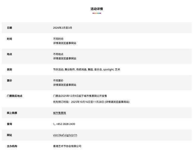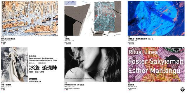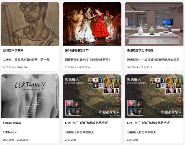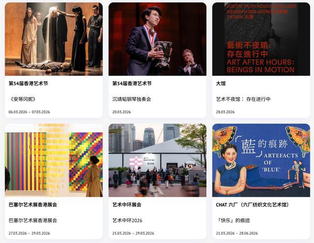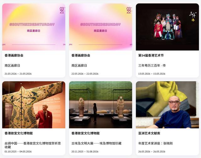 此外,还有许多丰富多元的艺文活动点亮全城,涵盖展览、表演、讲座、工作坊等多重形式,串联起香港各大核心文化地标与社区空间。香港艺术画廊协会打造的 #SouthsideSaturday 和 #SouthsideSunday 分别于2026年3月21日、22日举办,为南区带来沉浸式单日艺术体验;3月24日的《中环画廊日》、19日的《上环画廊夜》及26日的《早安!上环》,联动区域画廊打造专属艺术打卡路线,24日的《南区深夜艺术体验》更解锁夜间艺文氛围。第54届香港艺术节带来众多重磅表演,包括3月13日至15日的《粤剧三百年:转型》、3月6日至7日的经典戏剧《安提戈涅》、3月27日至29日的舞剧《牡丹亭之梦》,还有西班牙国家芭蕾舞团《美丽的奥特罗》、布尔诺国家剧院《叶甫盖尼・奥涅金》等国际剧目,以及沈诗哲钢琴独奏会、孙敏洙与圣马丁室内乐团演奏等音乐盛宴,同期开展的“艺术节加料节目及艺术教育活动” 与 “无界” 系列,让艺术深入社区与校园。